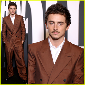 FYI: Timothee is wearing Givenchy. His custom look includes a brown wool double breasted jacket with peak lapel, worn with matching double pleated trousers, and white cotton shirt.